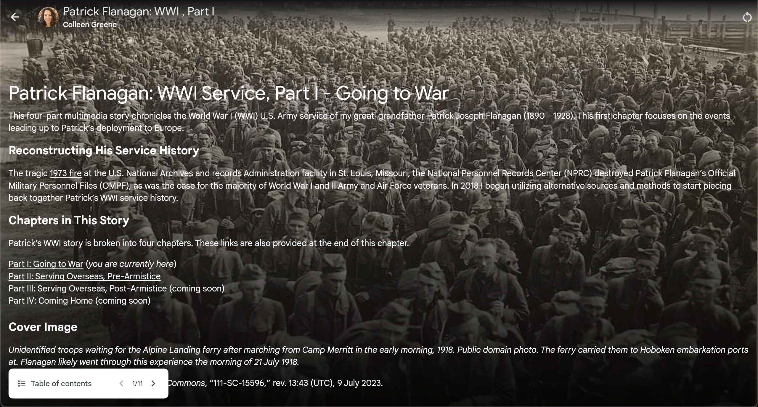 These digital multimedia stories chronicle the World War I U.S. Army service of my great-grandfather Private Patrick Flanagan (1980-1928). Despite Patrick’s Official Military Personnel File (OMPF) being burned in the tragic 1973 fire at the National Personnel Records Center (NPRC), I have been able to reconstruct all but one and a half months of Patrick’s Army service using alternative sources and methods. Because I heavily teach this type of storytelling, I have created versions of Patrick’s story on different digital platforms as teaching examples so people can compare the tools.
